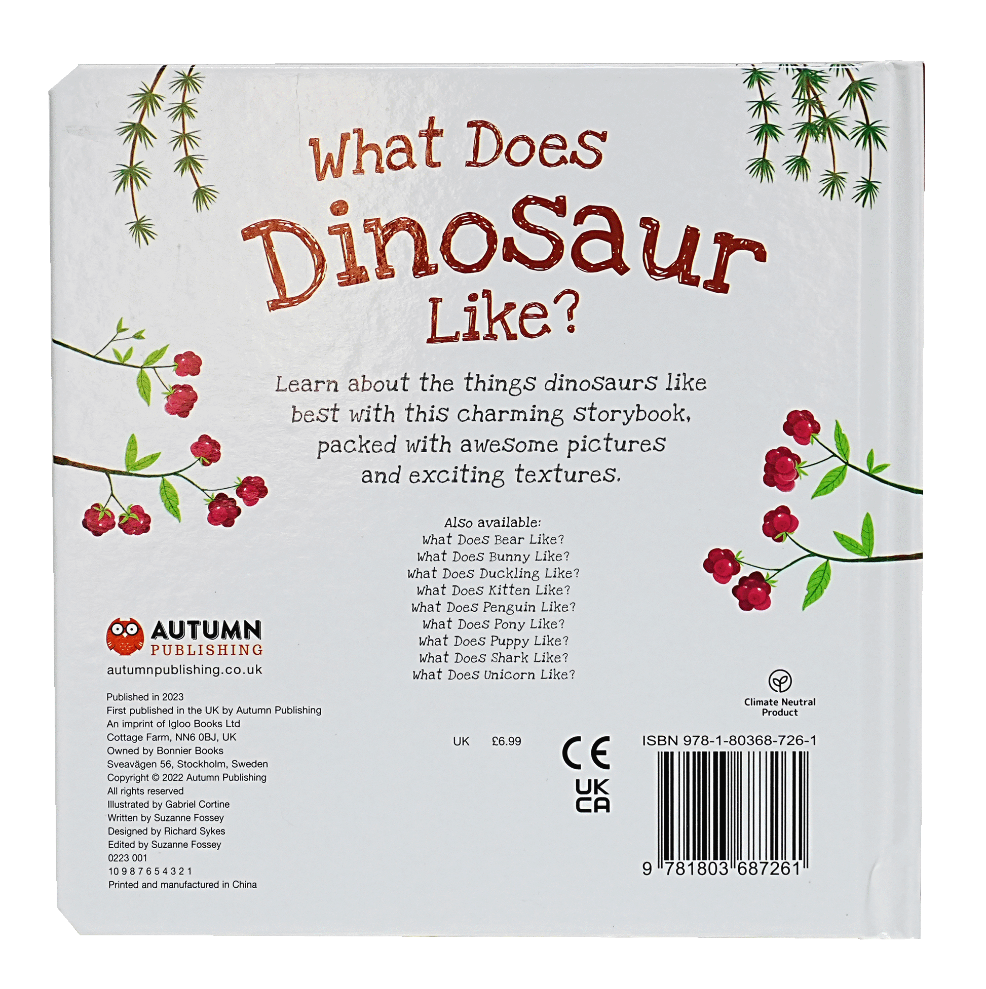 Meet Dinosaur and find out when he lived, what he liked to eat and just how big he really was. Introduces learning topics about the habits and lives of different animals as well as offering a storytime treat. Designed for maximum appeal with a simple, repeated formula, touch and feel textures on every spread and colourful illustrations on each page.