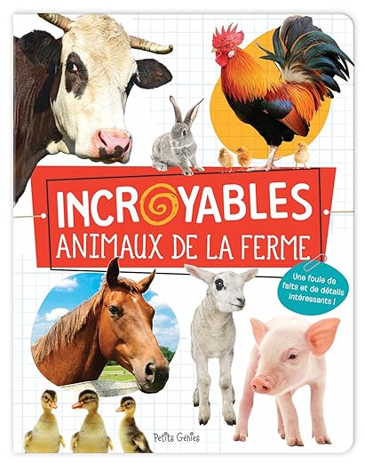Animaux de la ferme Les enfants raffolent des animaux de la ferme avec raison ! Ils sont tous incroyables ! Ce livre a tout pour satisfaire leur curiosité sur ces fascinantes créatures domestiquées : boeuf, cheval, âne, mouton, chèvre, lapin, cochon, autruche, volailles, et plus encore. On y trouve des informations étonnantes, des devinettes et de magnifiques illustrations en couleurs.